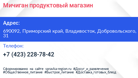 Мичиган, продуктовый магазин по адресу 690092, Приморский край, Владивосток, Добровольского, 31 в дальнейшем Организация, размещена в следующих категориях: