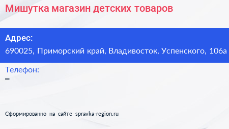 Мишутка, магазин детских товаров по адресу 690025, Приморский край, Владивосток, Успенского, 106а в дальнейшем Организация, размещена в следующих категориях: