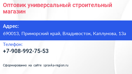 Оптовик, универсальный строительный магазин по адресу 690013, Приморский край, Владивосток, Каплунова, 13а в дальнейшем Организация, размещена в следующих категориях: