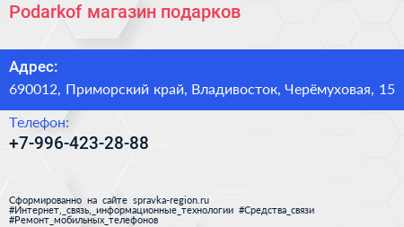 Podarkof, магазин подарков по адресу 690012, Приморский край, Владивосток, Черёмуховая, 15 в дальнейшем Организация, размещена в следующих категориях: