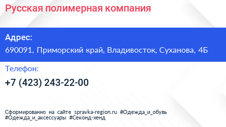 Русская полимерная компания по адресу 690091, Приморский край, Владивосток, Суханова, 4Б в дальнейшем Организация, размещена в следующих категориях: