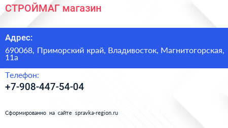 СТРОЙМАГ, магазин по адресу 690068, Приморский край, Владивосток, Магнитогорская, 11а в дальнейшем Организация, размещена в следующих категориях: