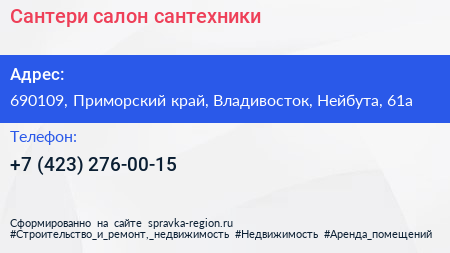 Сантери, салон сантехники по адресу 690109, Приморский край, Владивосток, Нейбута, 61а в дальнейшем Организация, размещена в следующих категориях: