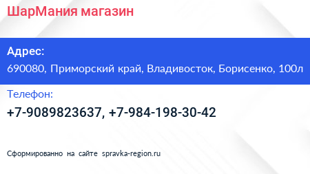 ШарМания, магазин по адресу 690080, Приморский край, Владивосток, Борисенко, 100л в дальнейшем Организация, размещена в следующих категориях:
