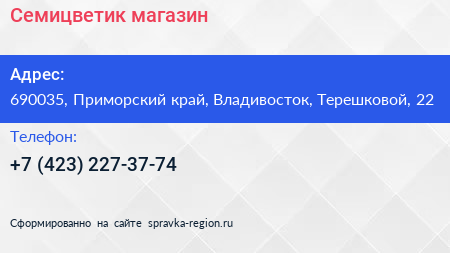 Семицветик, магазин по адресу 690035, Приморский край, Владивосток, Терешковой, 22 в дальнейшем Организация, размещена в следующих категориях: