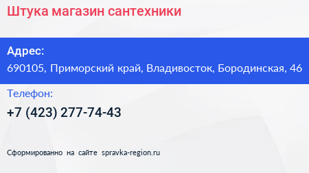 Штука, магазин сантехники по адресу 690105, Приморский край, Владивосток, Бородинская, 46 в дальнейшем Организация, размещена в следующих категориях: