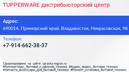 TUPPERWARE, дистрибьюторский центр по адресу 690014, Приморский край, Владивосток, Некрасовская, 98 в дальнейшем Организация, размещена в следующих категориях: