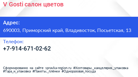 V.Gosti, салон цветов по адресу 690003, Приморский край, Владивосток, Посьетская, 13 в дальнейшем Организация, размещена в следующих категориях: