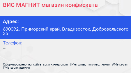 ВИС-МАГНИТ, магазин конфиската по адресу 690092, Приморский край, Владивосток, Добровольского, 35 в дальнейшем Организация, размещена в следующих категориях: