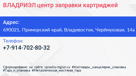 ВЛАДРИЭЛ, центр заправки картриджей по адресу 690021, Приморский край, Владивосток, Черёмуховая, 14а в дальнейшем Организация, размещена в следующих категориях: