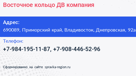 Восточное кольцо ДВ, компания по адресу 690089, Приморский край, Владивосток, Днепровская, 92а в дальнейшем Организация, размещена в следующих категориях: