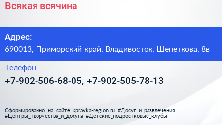 Всякая всячина по адресу 690013, Приморский край, Владивосток, Шепеткова, 8в в дальнейшем Организация, размещена в следующих категориях: