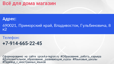 Всё для дома, магазин по адресу 690021, Приморский край, Владивосток, Гульбиновича, 8 к2 в дальнейшем Организация, размещена в следующих категориях: