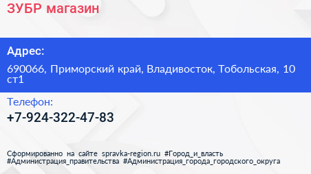 ЗУБР!, магазин по адресу 690066, Приморский край, Владивосток, Тобольская, 10 ст1 в дальнейшем Организация, размещена в следующих категориях:
