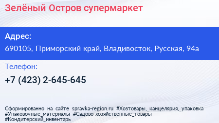 Зелёный Остров, супермаркет по адресу 690105, Приморский край, Владивосток, Русская, 94а в дальнейшем Организация, размещена в следующих категориях: