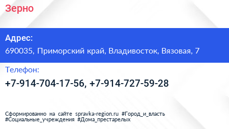 Зерно по адресу 690035, Приморский край, Владивосток, Вязовая, 7 в дальнейшем Организация, размещена в следующих категориях: