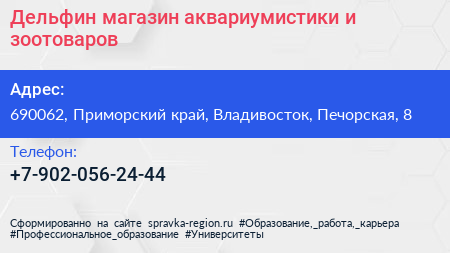 Дельфин, магазин аквариумистики и зоотоваров по адресу 690062, Приморский край, Владивосток, Печорская, 8 в дальнейшем Организация, размещена в следующих категориях: