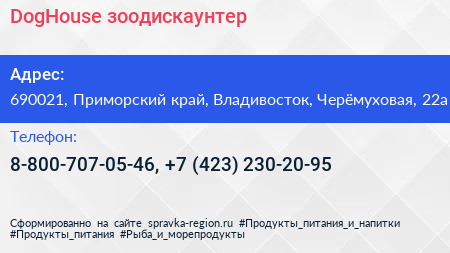DogHouse, зоодискаунтер по адресу 690021, Приморский край, Владивосток, Черёмуховая, 22а в дальнейшем Организация, размещена в следующих категориях: