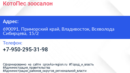 КотоПес, зоосалон по адресу 690091, Приморский край, Владивосток, Всеволода Сибирцева, 15/2 в дальнейшем Организация, размещена в следующих категориях: