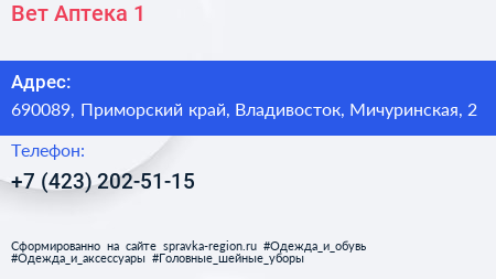 Вет Аптека №1 по адресу 690089, Приморский край, Владивосток, Мичуринская, 2 в дальнейшем Организация, размещена в следующих категориях: