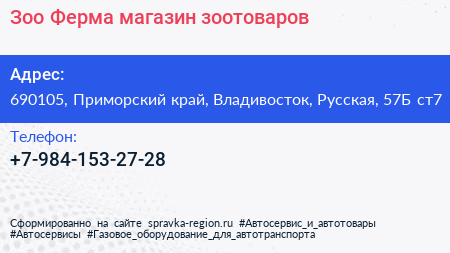 Зоо Ферма, магазин зоотоваров по адресу 690105, Приморский край, Владивосток, Русская, 57Б ст7 в дальнейшем Организация, размещена в следующих категориях: