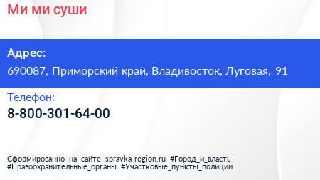 Ми-ми суши по адресу 690087, Приморский край, Владивосток, Луговая, 91 в дальнейшем Организация, размещена в следующих категориях: