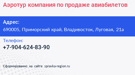 Аэротур, компания по продаже авиабилетов по адресу 690005, Приморский край, Владивосток, Луговая, 21а в дальнейшем Организация, размещена в следующих категориях: