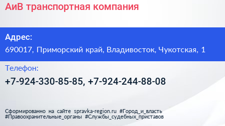 АиВ, транспортная компания по адресу 690017, Приморский край, Владивосток, Чукотская, 1 в дальнейшем Организация, размещена в следующих категориях: