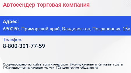 Автосендер, торговая компания по адресу 690090, Приморский край, Владивосток, Пограничная, 15в в дальнейшем Организация, размещена в следующих категориях: