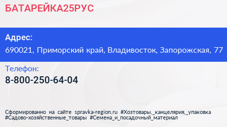 БАТАРЕЙКА25РУС по адресу 690021, Приморский край, Владивосток, Запорожская, 77 в дальнейшем Организация, размещена в следующих категориях: