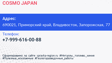 COSMO JAPAN по адресу 690021, Приморский край, Владивосток, Запорожская, 77 в дальнейшем Организация, размещена в следующих категориях: