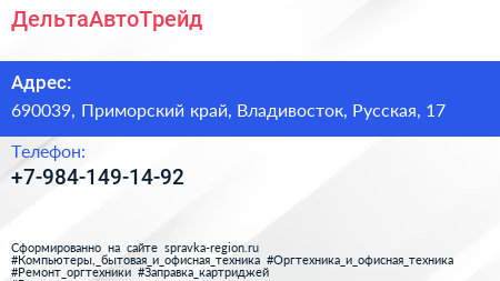 ДельтаАвтоТрейд по адресу 690039, Приморский край, Владивосток, Русская, 17 в дальнейшем Организация, размещена в следующих категориях:
