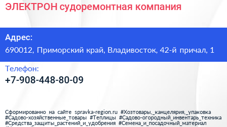 ЭЛЕКТРОН, судоремонтная компания по адресу 690012, Приморский край, Владивосток, 42-й причал, 1 в дальнейшем Организация, размещена в следующих категориях: