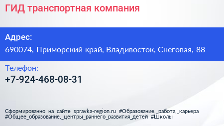 ГИД, транспортная компания по адресу 690074, Приморский край, Владивосток, Снеговая, 88 в дальнейшем Организация, размещена в следующих категориях: