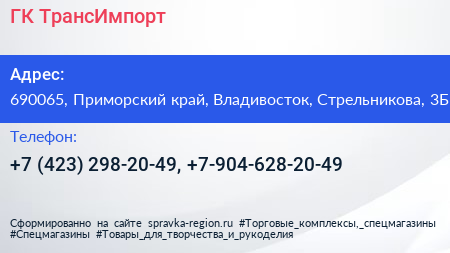 ГК ТрансИмпорт по адресу 690065, Приморский край, Владивосток, Стрельникова, 3Б в дальнейшем Организация, размещена в следующих категориях:
