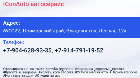 IConAuto, автосервис по адресу 690022, Приморский край, Владивосток, Лесная, 12а в дальнейшем Организация, размещена в следующих категориях: