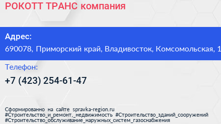 РОКОТТ ТРАНС, компания по адресу 690078, Приморский край, Владивосток, Комсомольская, 1 в дальнейшем Организация, размещена в следующих категориях: