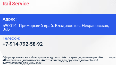 Rail Service по адресу 690014, Приморский край, Владивосток, Некрасовская, 36Б в дальнейшем Организация, размещена в следующих категориях: