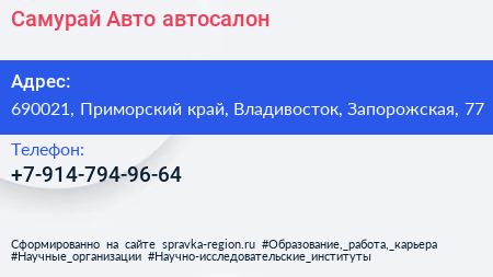 Самурай Авто, автосалон по адресу 690021, Приморский край, Владивосток, Запорожская, 77 в дальнейшем Организация, размещена в следующих категориях:
