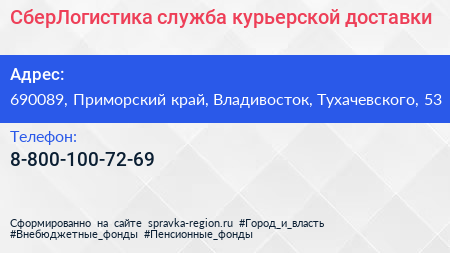 СберЛогистика, служба курьерской доставки по адресу 690089, Приморский край, Владивосток, Тухачевского, 53 в дальнейшем Организация, размещена в следующих категориях: