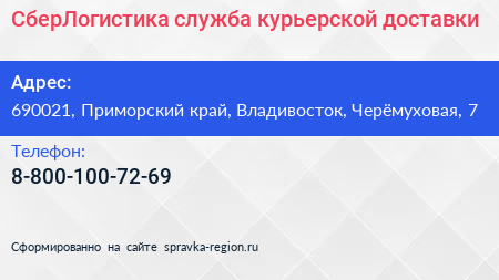 СберЛогистика, служба курьерской доставки по адресу 690021, Приморский край, Владивосток, Черёмуховая, 7 в дальнейшем Организация, размещена в следующих категориях: