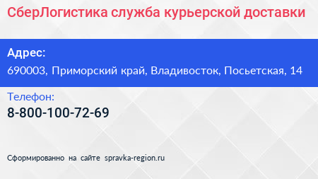 СберЛогистика, служба курьерской доставки по адресу 690003, Приморский край, Владивосток, Посьетская, 14 в дальнейшем Организация, размещена в следующих категориях: