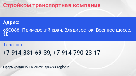 Стройком, транспортная компания по адресу 690088, Приморский край, Владивосток, Военное шоссе, 1Б в дальнейшем Организация, размещена в следующих категориях: