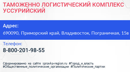 ТАМОЖЕННО ЛОГИСТИЧЕСКИЙ КОМПЛЕКС УССУРИЙСКИЙ по адресу 690090, Приморский край, Владивосток, Пограничная, 15в в дальнейшем Организация, размещена в следующих категориях: