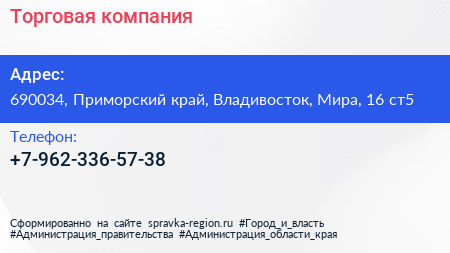 Торговая компания по адресу 690034, Приморский край, Владивосток, Мира, 16 ст5 в дальнейшем Организация, размещена в следующих категориях: