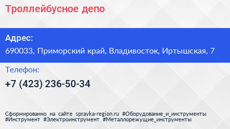 Троллейбусное депо по адресу 690033, Приморский край, Владивосток, Иртышская, 7 в дальнейшем Организация, размещена в следующих категориях: