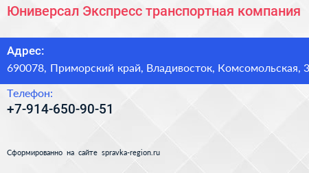 Юниверсал Экспресс, транспортная компания по адресу 690078, Приморский край, Владивосток, Комсомольская, 3 в дальнейшем Организация, размещена в следующих категориях: