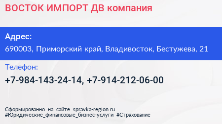 ВОСТОК ИМПОРТ ДВ, компания по адресу 690003, Приморский край, Владивосток, Бестужева, 21 в дальнейшем Организация, размещена в следующих категориях: