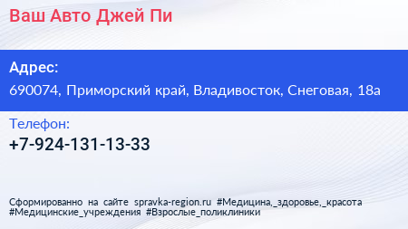 Ваш Авто Джей Пи по адресу 690074, Приморский край, Владивосток, Снеговая, 18а в дальнейшем Организация, размещена в следующих категориях: