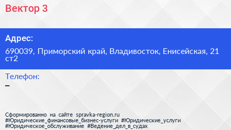 Вектор-3 по адресу 690039, Приморский край, Владивосток, Енисейская, 21 ст2 в дальнейшем Организация, размещена в следующих категориях: